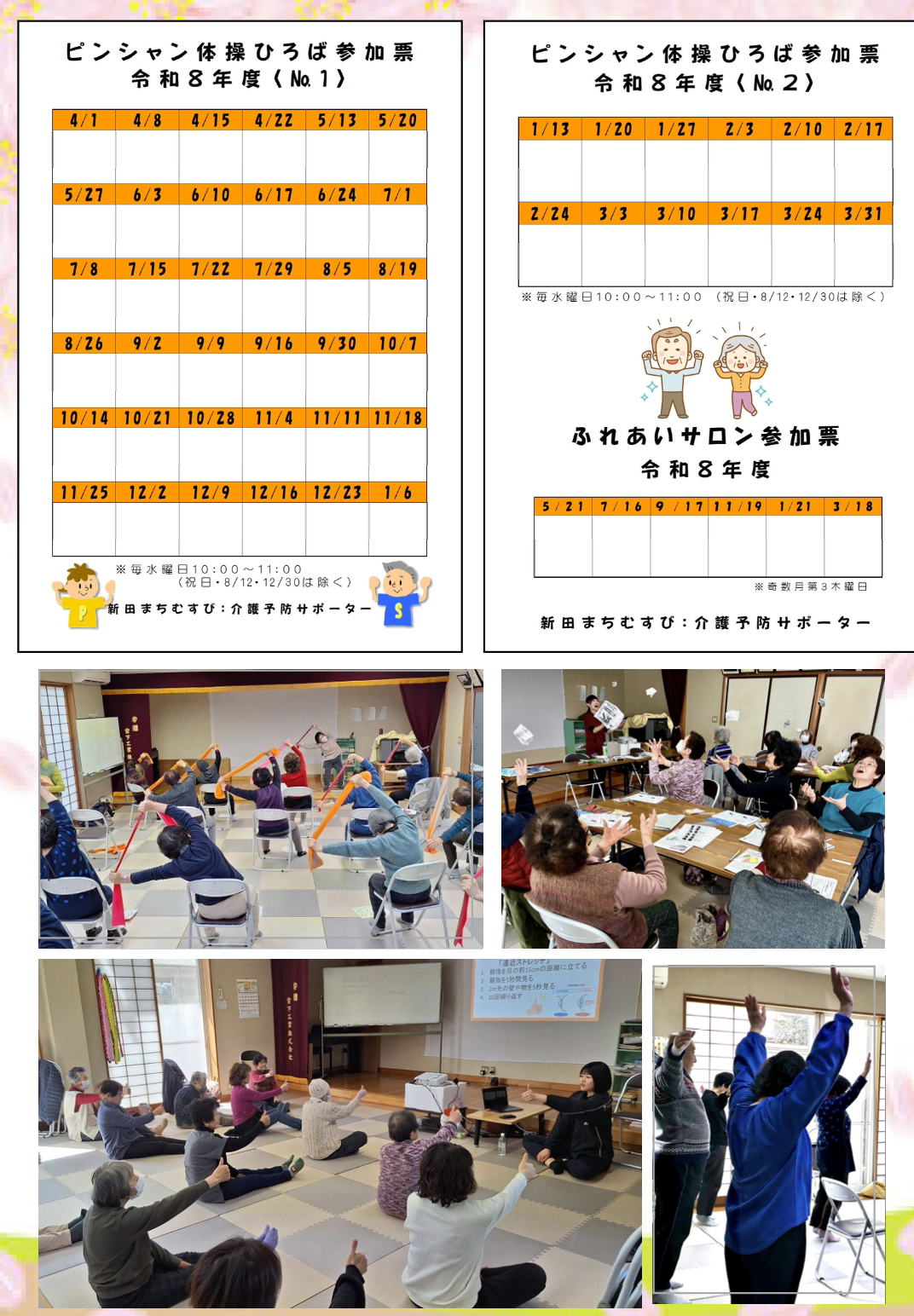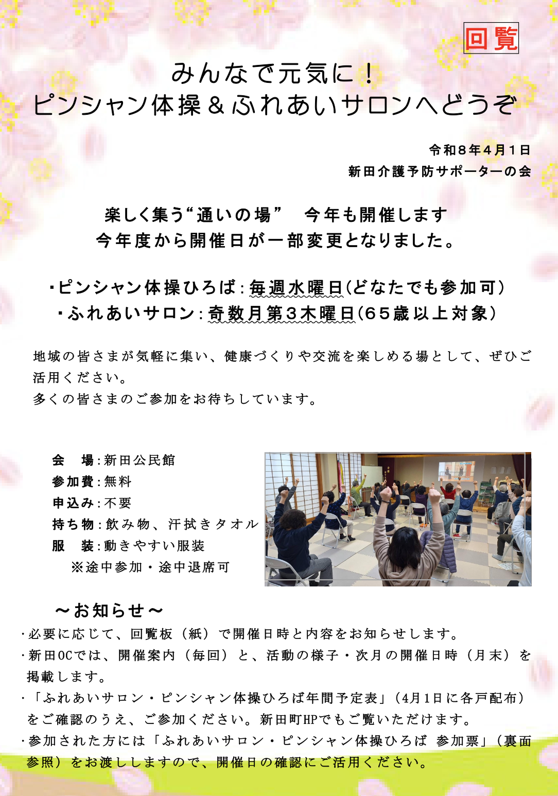 2026-04-01 ピンシャン体操&ふれあいサロン Home › news › ピンシャン体操&ふれあいサロン 関連記事 令和7年度新田ふれあいサロン予定表 新田回覧板令和八年如月 新田回覧板令和八年四月 新田カフェ&新田推しスポット写真展 8月21日ピンシャン体操ひろば 新田だより第196号 新田カフェ 新田人大募集